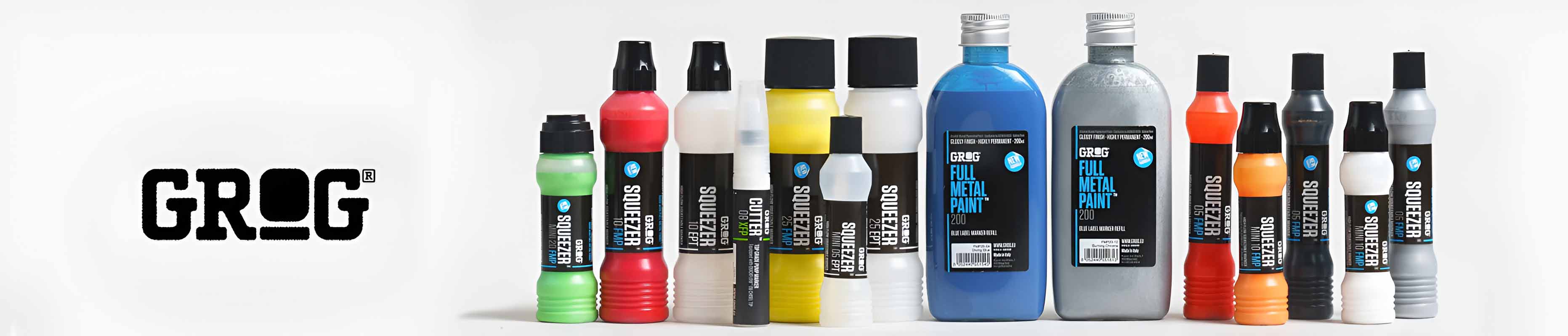 Η GROG είναι από τις πιο δημοφιλείς μάρκες στον κόσμο του graffiti και της street art, προσφέροντας μαρκαδόρους ανεξίτηλου μελανιού, squeezers, mops, cutters και refills υψηλής ποιότητας. Δημιουργημένη για επαγγελματίες καλλιτέχνες, writers αλλά και DIY projects, η GROG έχει γίνει συνώνυμο της αξιοπιστίας και της έντονης κάλυψης.