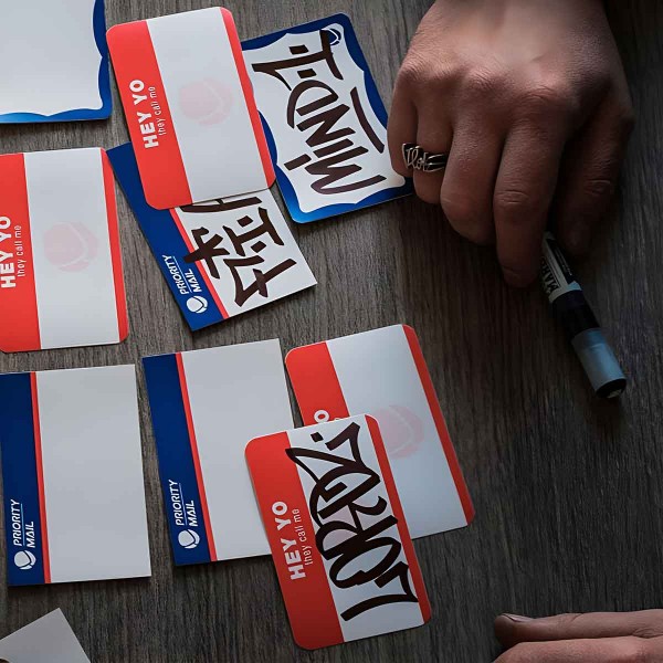 Τα αυτοκόλλητα "Blue Frame" έχουν τον κλασικό σχεδιασμό "πρότυπο ετικέτας", φέρνοντας πίσω την αισθητική των δια βίου ετικετών που συμπληρώνετε μόνοι σας για να ονομάσετε οποιοδήποτε είδος αντικειμένου, φακέλου ή γραμματοκιβωτίου για παραδείγμα. Αυτός είναι ένας τύπος αυτοκόλλητης ετικέτας που το graffiti έχει χρησιμοποιήσει ως εργαλείο βομβαρδισμού.